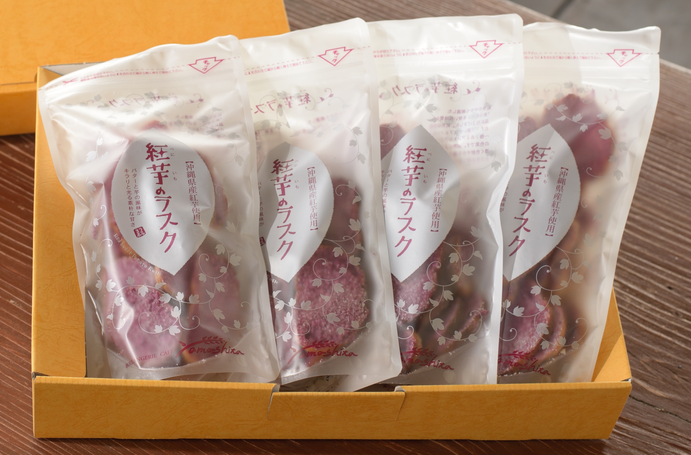 紅芋のラスク 紅芋の中から厳選した「美ら恋芋」を使い、風味豊かな一品に仕上げました。 紅色は抗酸化作用の高いポリフェノールの一種であるアントシアニン由来の色素です。 加熱によりさらに濃く色鮮やかな極上の紅芋のラスクをお楽しみください。 |